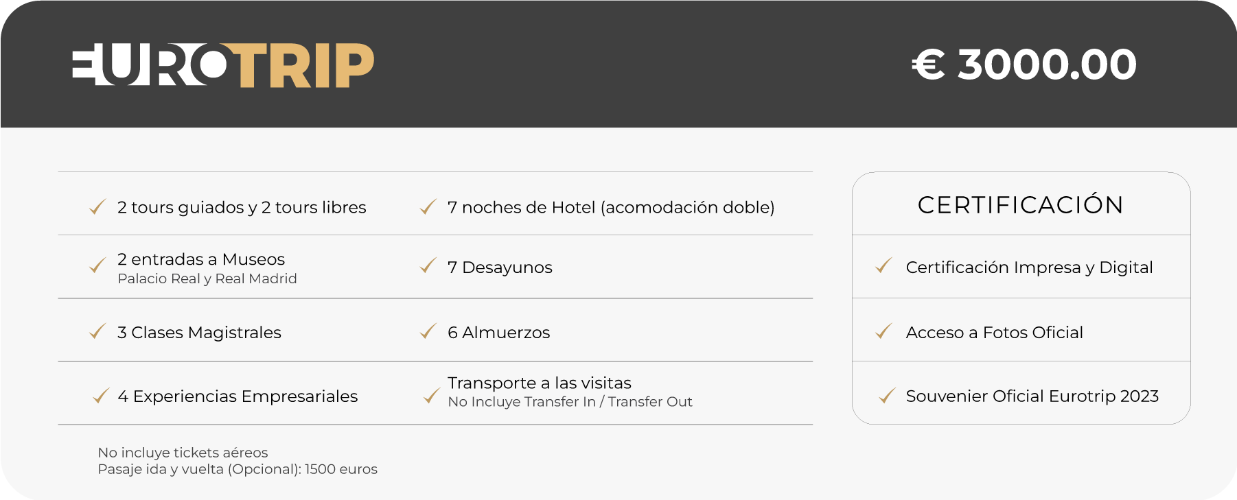 De preferencia comprar tu pasaje aéreo para partir en la noche del sábado, así aterrizas el domingo en Madrid, y por la diferencia horaria, estarás instalado en tu hotel a media tarde, aprovechando unas horas para recorrer las inmediaciones del hotel y hacer una primera visita turística, te recomendamos esa noche, cenar en el Mercado San Miguel, un especial centro turístico gastronómico de España. Recuerdo que el costo del Eurotrip incluye tu hospedaje desde el medio día del domingo en adelante.